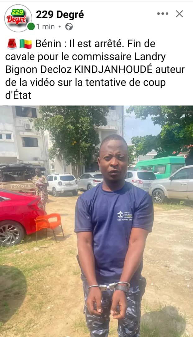 hostile contre le pouvoir, le commissaire de police, identifié sous le nom de Landry Bignon Delcoz Kindjanhoundé a été interpellé. L’officier de policie apparaissait dans une courte séquence diffusée sur les réseaux sociaux le 8 décembre. Dans cette vidéo, il s’en prenait vivement au chef de l’État et exigeait sa démission. « Moi, capitaine Kin-djanhoudé, je lui donne 24 heures pour déposer sa démission. Lui et toute sa clique, son gouvernement y compris », déclare-t-il dans la vidéo. Ces propos, jugés particulièrement graves par les autorités, intervenaient au lendemain de la tentative de coup d’État avortée du 7 décembre. Il va répondre de ses actes devant la CRIET.